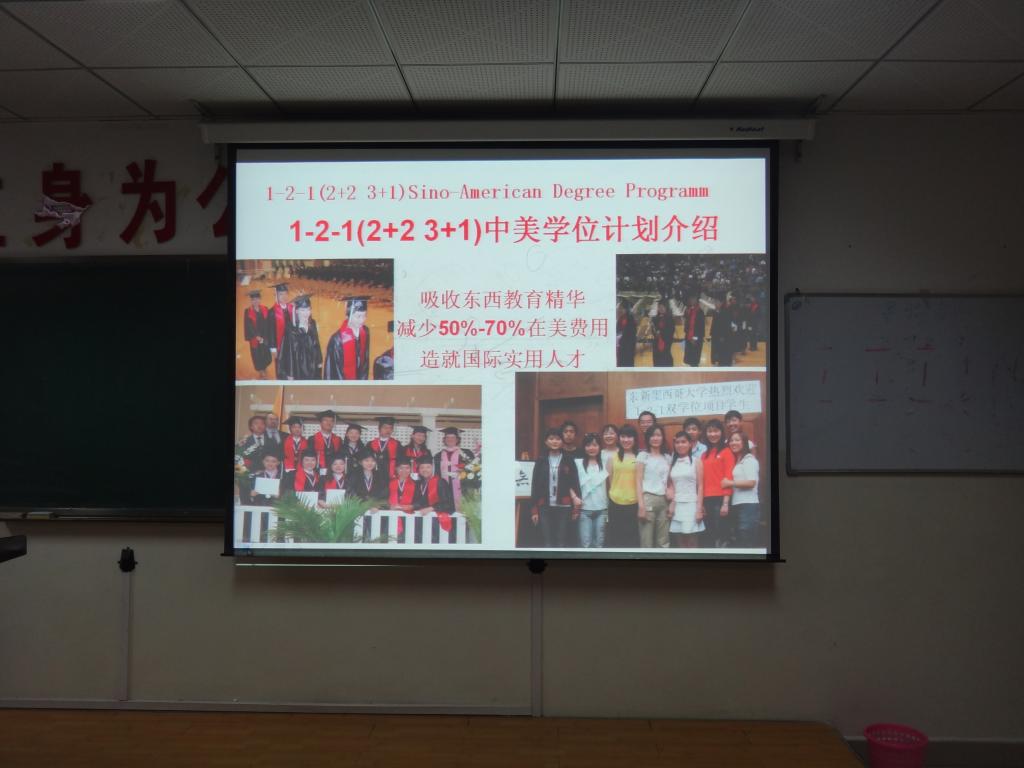 2014年2月28日15点,应我校国际文化交流学院邀请,美国国际经济文化交流协会中国全权代表赵柏淙先生,在玉章楼5101教室作了我校与美国东新墨西哥大学、科罗拉多州立大学普韦布洛分校“2+2”“3+1”中美双学位计划 、“3+2”中美本硕连读、“1+X”中美硕士双学位项目专题说明会,我校50余名学生前往听取了讲座。