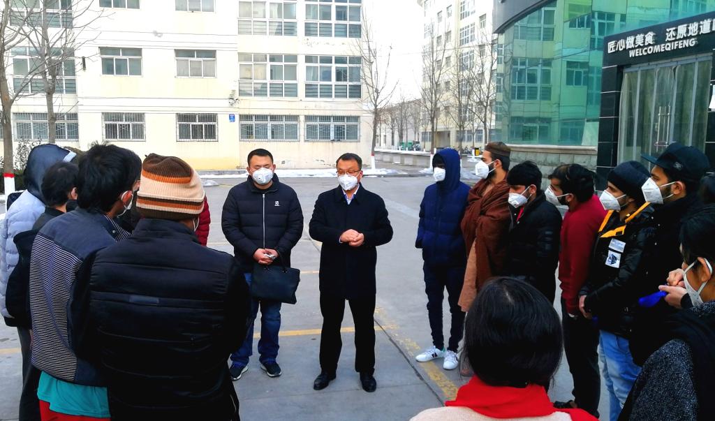 131日下午,从咸阳返校的王刚副校长带领国际处疫情防控小组梁润生、杨向宏和张杰到留学生公寓看望并慰问在校留学生,并对我处疫情防控工作提出明确要求。