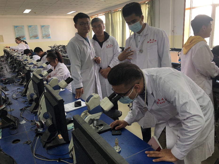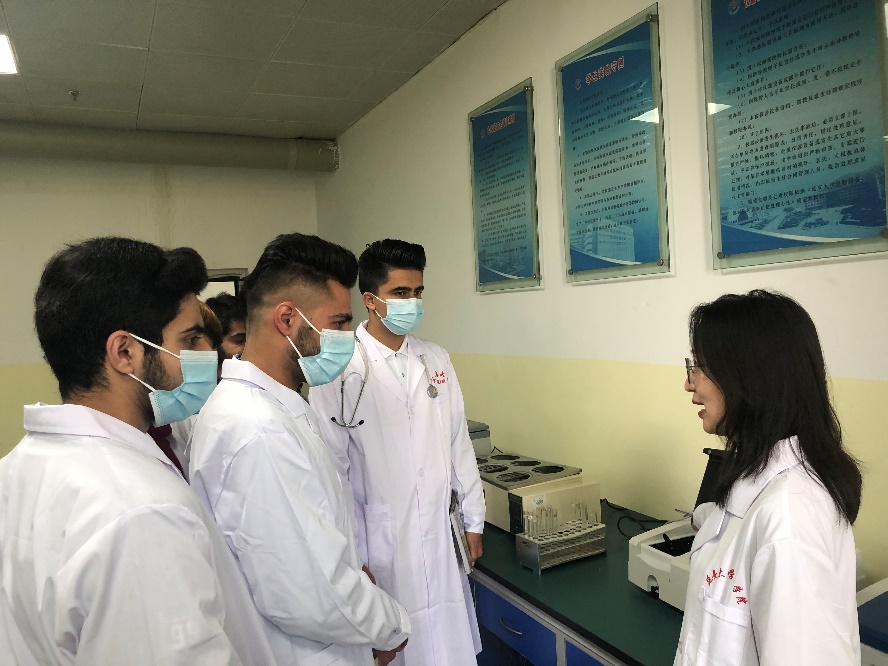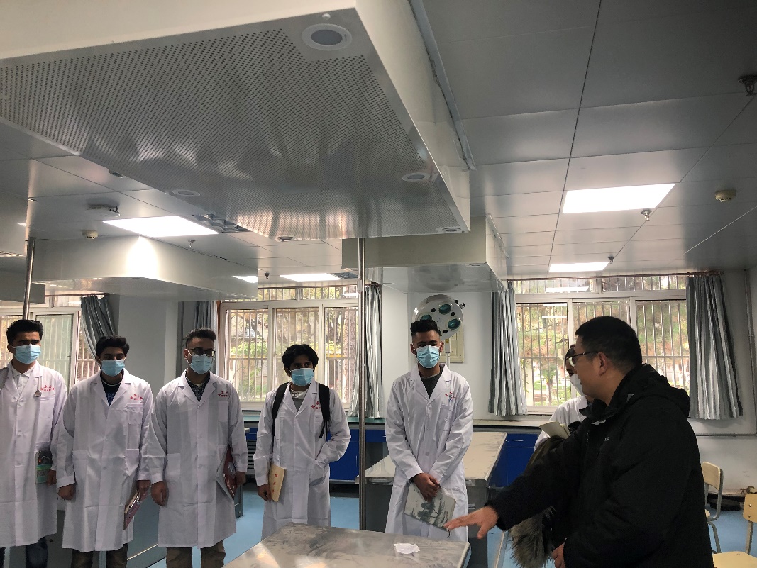 接下来留学生们参观了标本实验室,黄小勇老师对临床标本进行了详细讲解。随后留学生们来到了麻醉实验室,此时中国学生正在进行对兔子的麻醉实验,中外学生进行了友好的交流学习。此后,留学生们参观了生物化学实验室,在老师的讲解下,对于实验的仪器以及原理具备了初步的认识。
