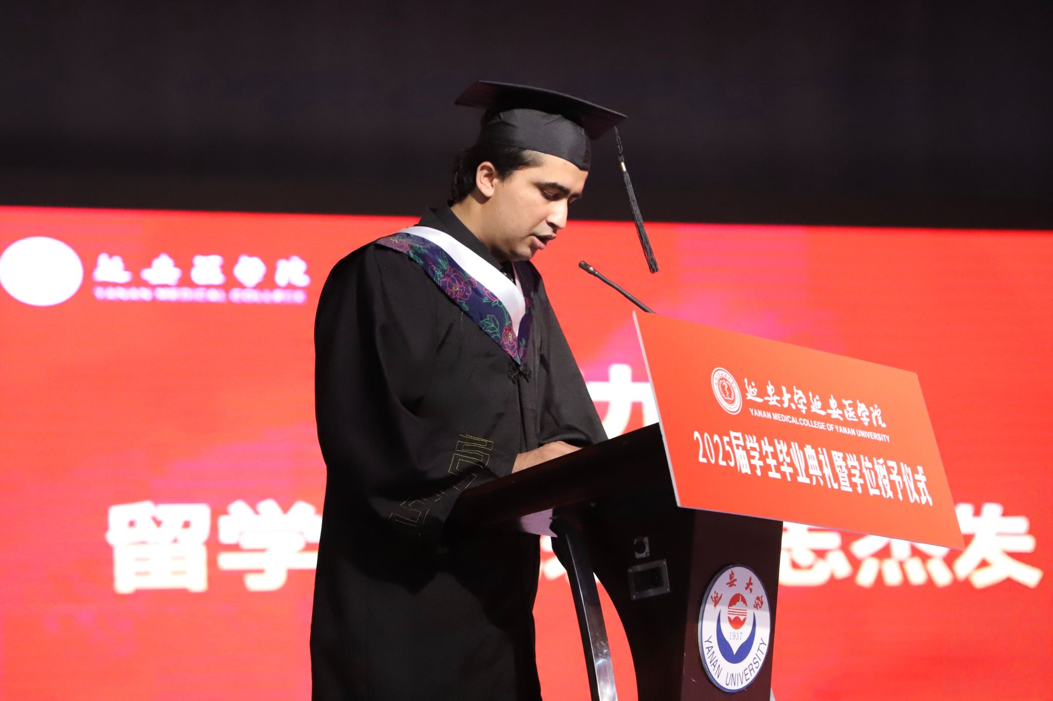 学位授予仪式上,全体毕业生身着学位服,满怀激动与自豪,陆续走上主席台。导师们为他们一一拨穗,这一庄重的仪式象征着他们学有所成,即将开启新的人生篇章。国际学生代表北志杰在发言中深情回顾了在MILE米乐中国的学习生活。他表示,学校提供了优质的学习环境和丰富的学术资源,老师们的悉心教导使他在专业知识和技能上取得了长足进步。他特别提到,在延大的学习经历让他深入领略了中国文化的魅力,也让他更加坚定了成为友好使者的决心。他表示将继续深入学习中国文化,见证新时代中国的蓬勃发展,通过不断的学习和交流,促进两国人民民心相通,为构建巴中命运共同体贡献自己的力量。