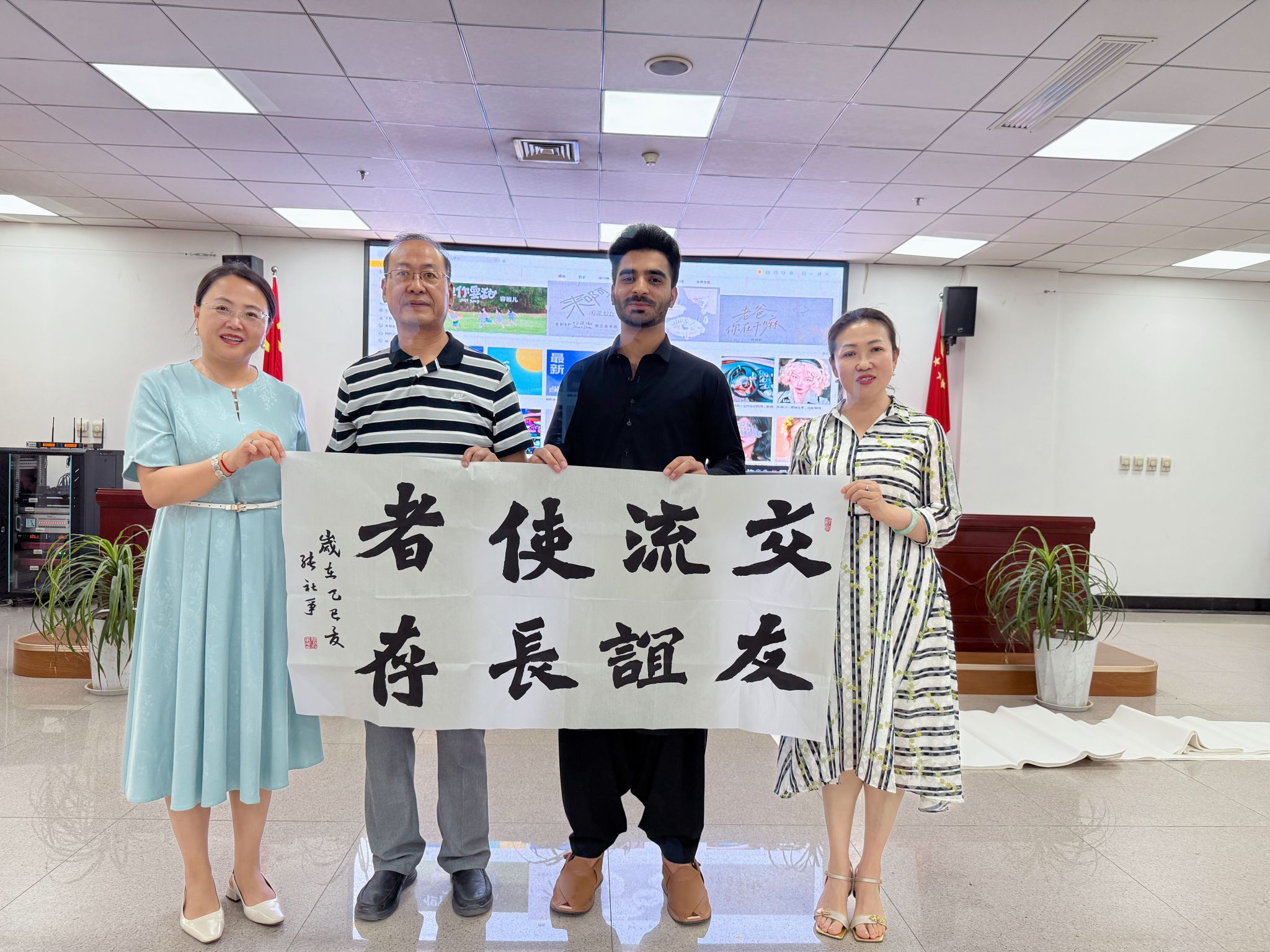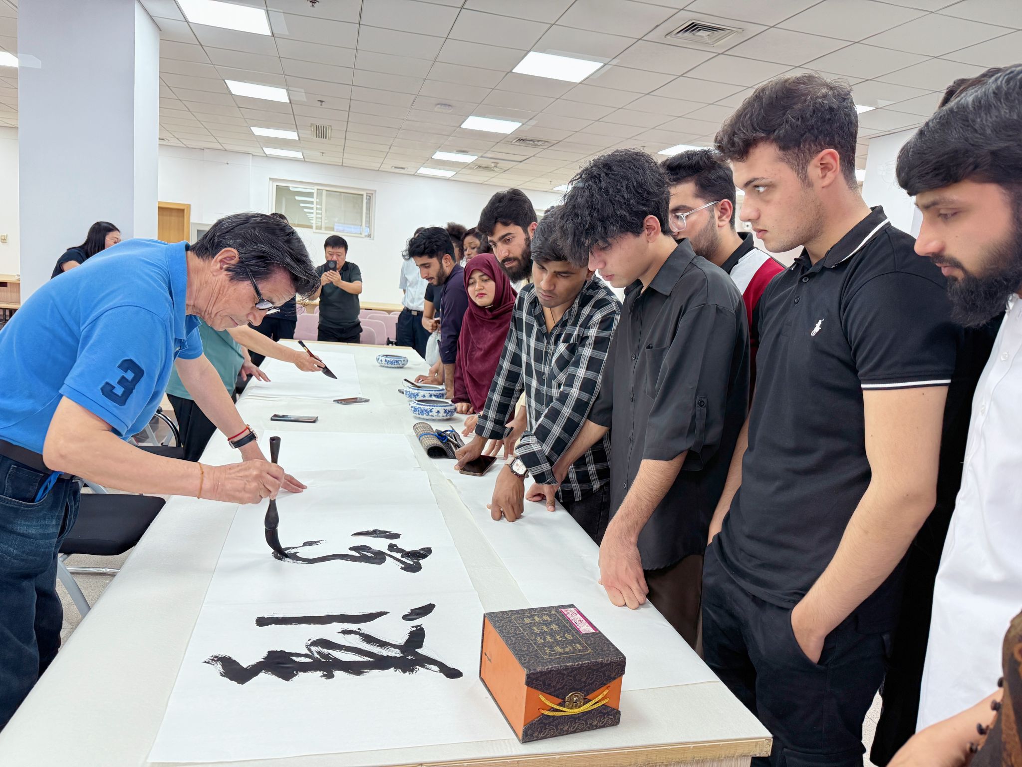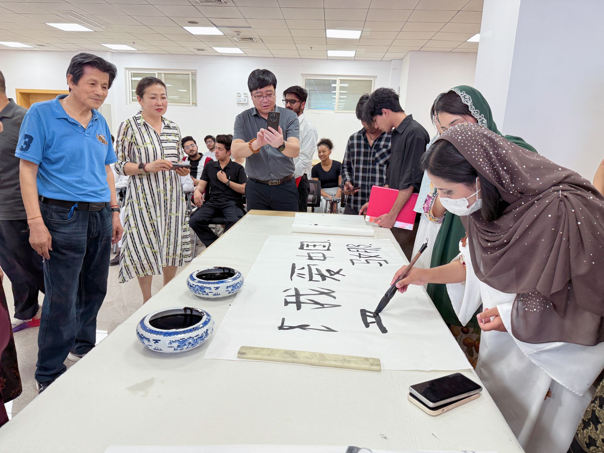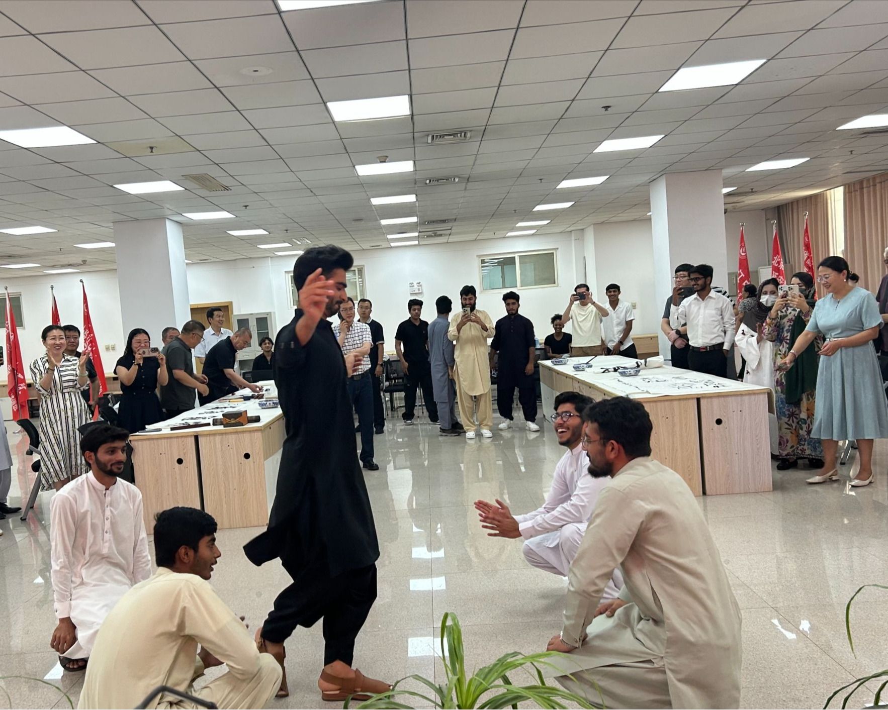 在书法书写展示与书写学习交流环节,王双才、刘平安、白亚军等10余位老师向留学生展示了书法书写与作品创作过程,指导留学生学习汉字毛笔书写技术,不少留学生惊叹中国书法的神奇,不时好奇提问,老师们耐心解答,悉心指导。现场气氛热烈,其乐融融。期间,特邀嘉宾马小惠老师表演了笛子独奏《扬鞭催马运粮忙》,尼泊尔留学生尚亚达演唱了歌曲《祝您万事如意》(Mayale bhadhyo laore saam),巴基斯坦留学生立轩、王七、李现等表演了巴基斯坦传统舞蹈,爱琳、欣妍等进行了诗歌朗诵《遥远的灯塔》等,再次将书法交流活动推向高潮。