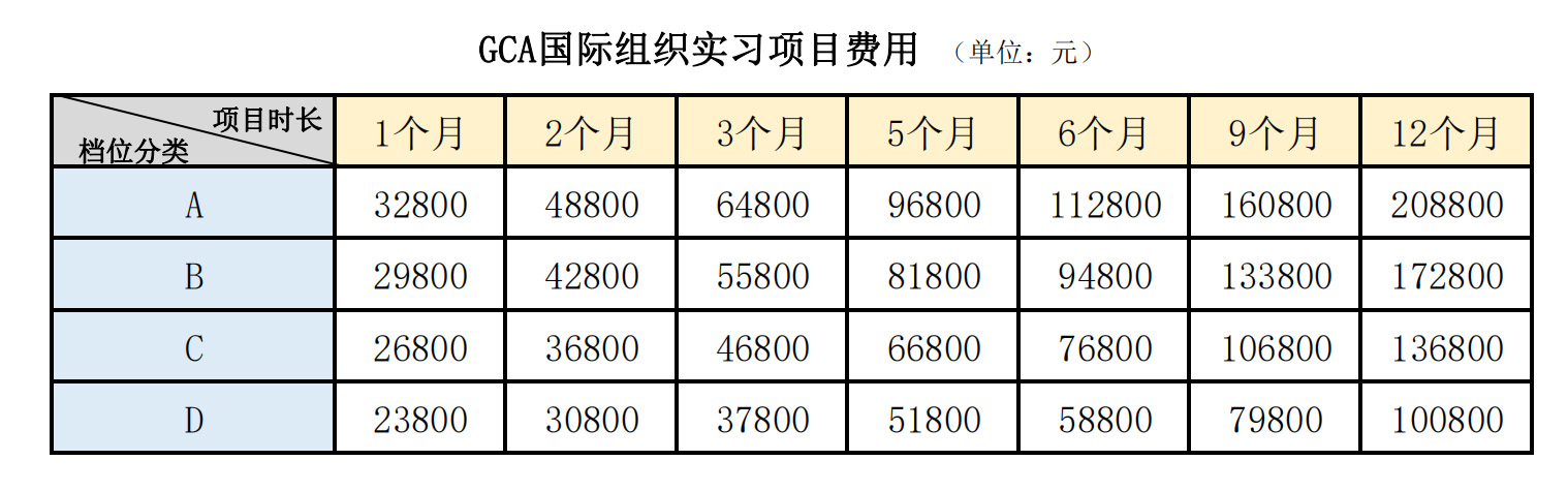报名参加项目学生,顺利完成国际组织实习任务并经考核合格后可以申请GCA国际教育集团奖学金资助,我校提供2000元/人项目资助费用(网络实习除外)。