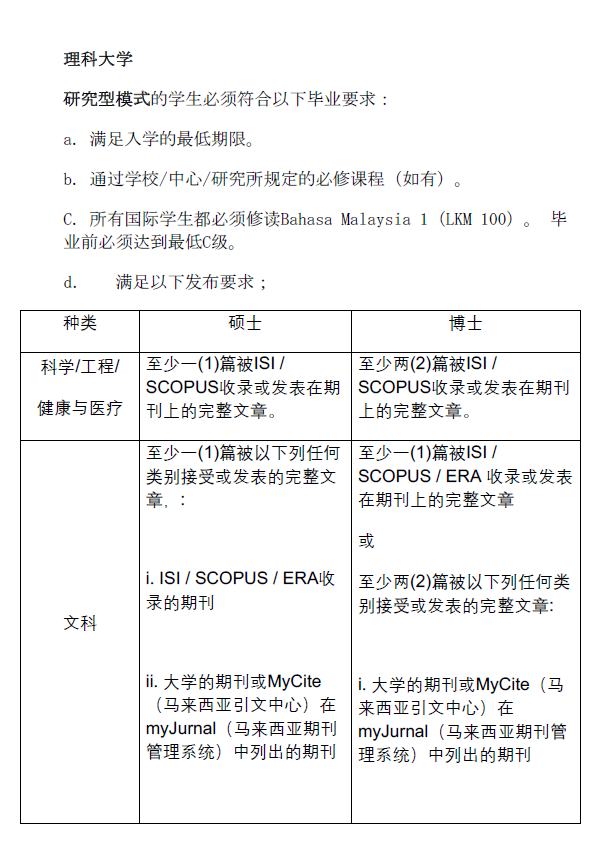马来西亚理科大学在博士培养方面主要采用研究式教学培养模式,由专业导师教授带领学生授课,参与科研,没有固定学制学分要求,整个博士培养时间为3-6年(根据不同专业而定),概括分为三个阶段,第一阶段主要培养语言水平、制定培养计划、公共专业基础研究方法论等课程;第二阶段核心课程与科研,研究方法,定量研究等;第三阶段课题研究,论文写作、发表,毕业答辩等。其中第一阶段分为4个月左右的语言水平提升和2个月左右的公共专业课(有雅思成绩者不需要参加语言课程提升),第二、三阶段根据导师教授和学员制定的培养计划自主完成。